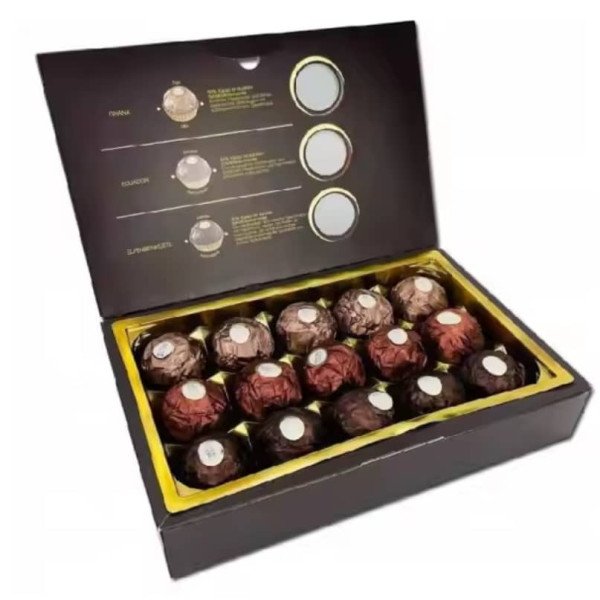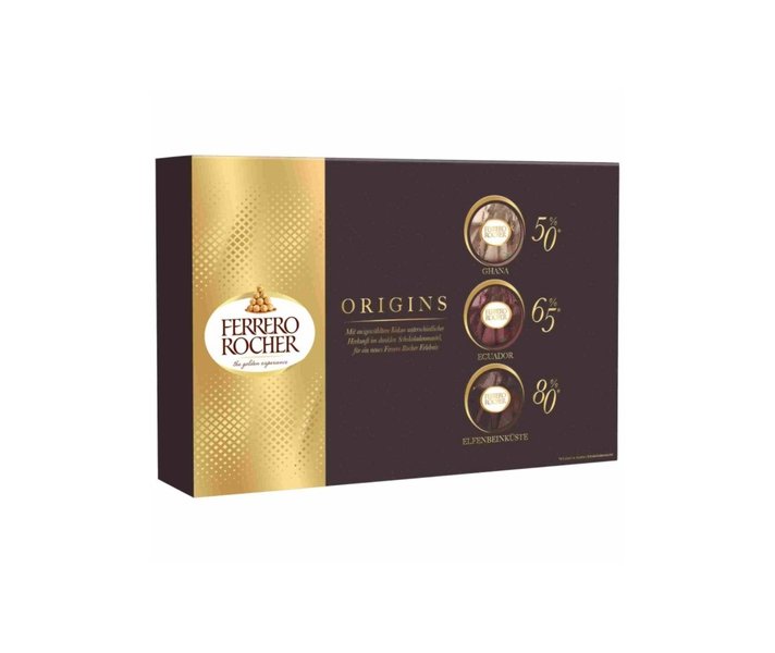 – Ferrero Rocher Origins T15 features 15 individually wrapped pralines, each with a unique dark chocolate experience.